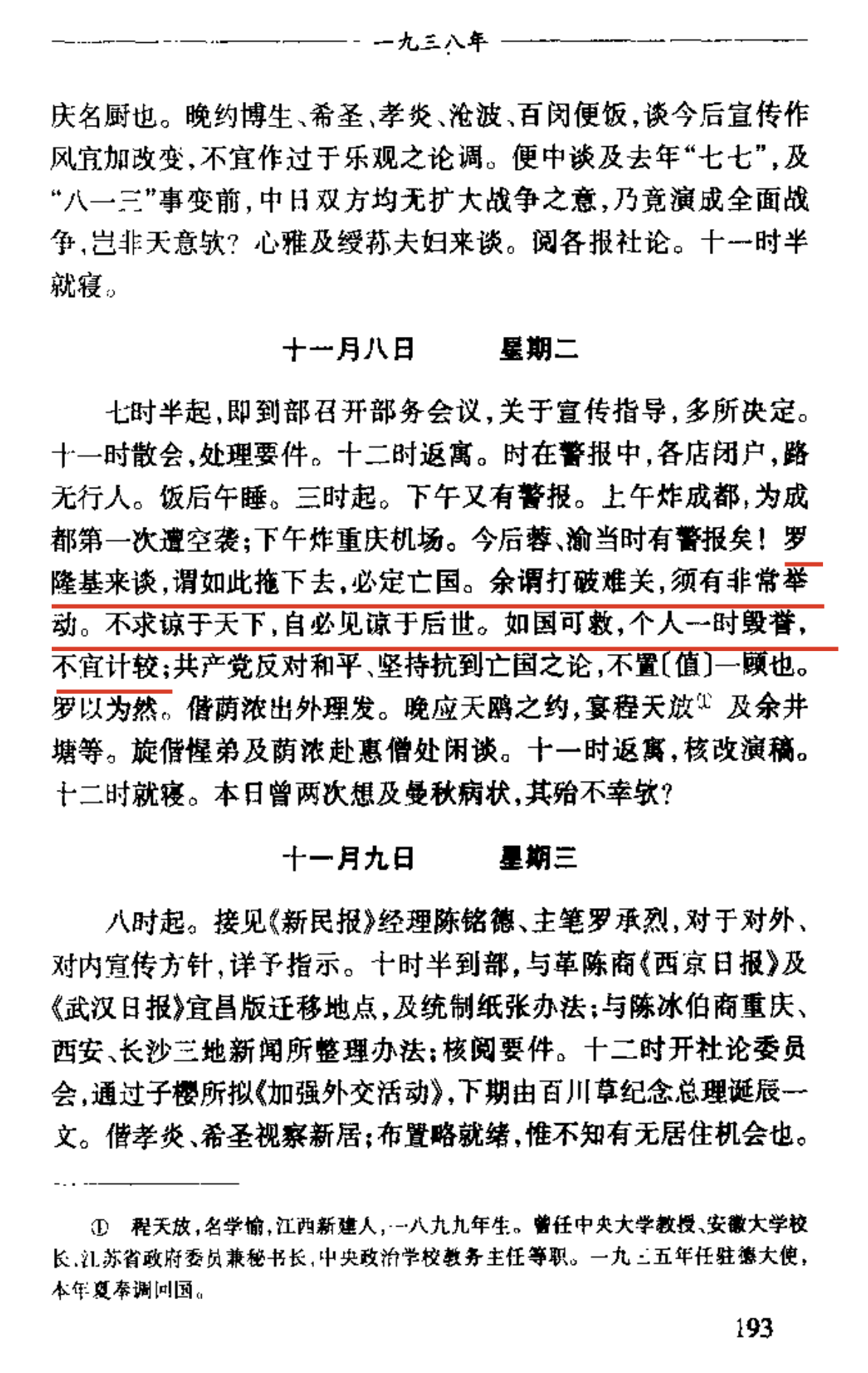 惟翻查作者所引用的《周佛海日記》,我們發現這番對話是周佛海與羅隆基之對話,該日的日記條目上根本沒有提及汪精衛的名字。